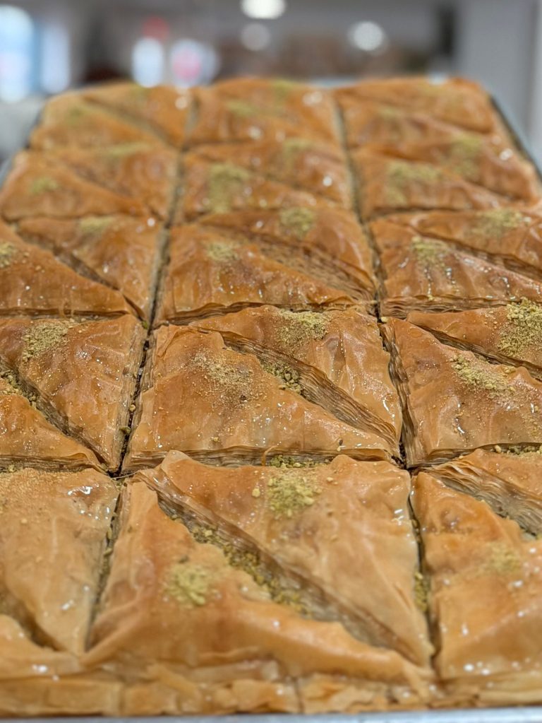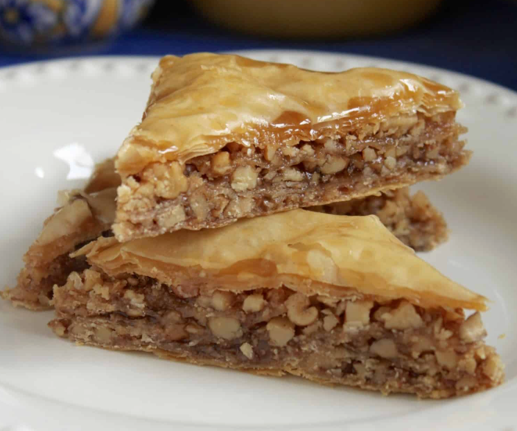 Flaky layers of phyllo filled with pistachios and lightly sweetened with syrup.