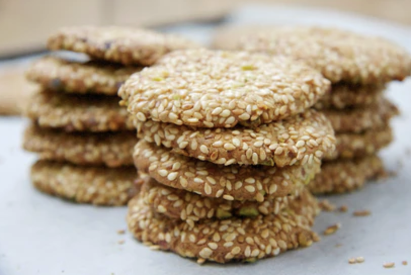 Crisp sesame cookies with a pistachio center, lightly sweet and nutty.